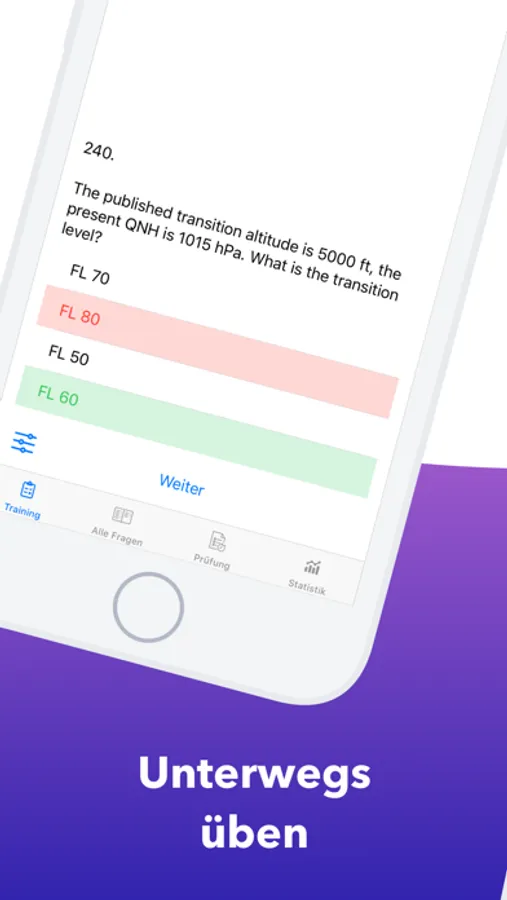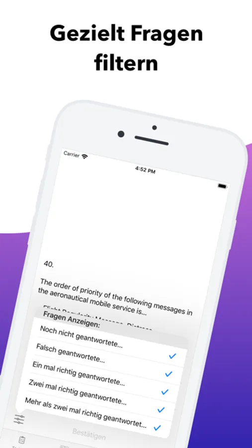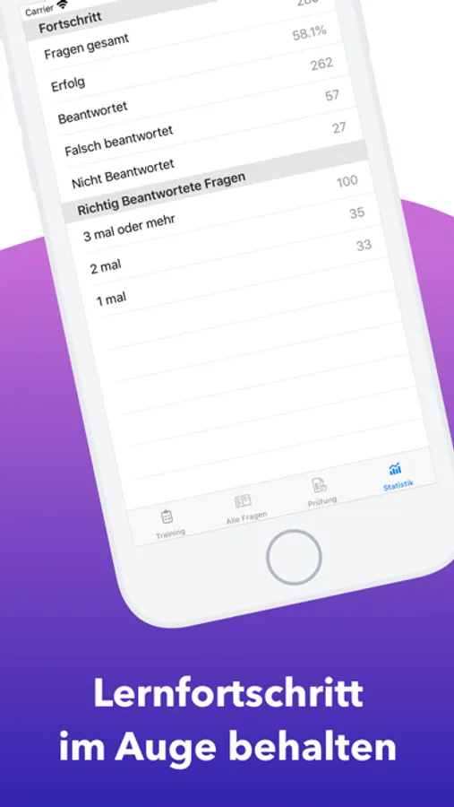 - Auswahl der Trainingsfragen nach Lernfortschritt und somit die Möglichkeit sich auf die schwierigen Fragen zu konzentrieren.