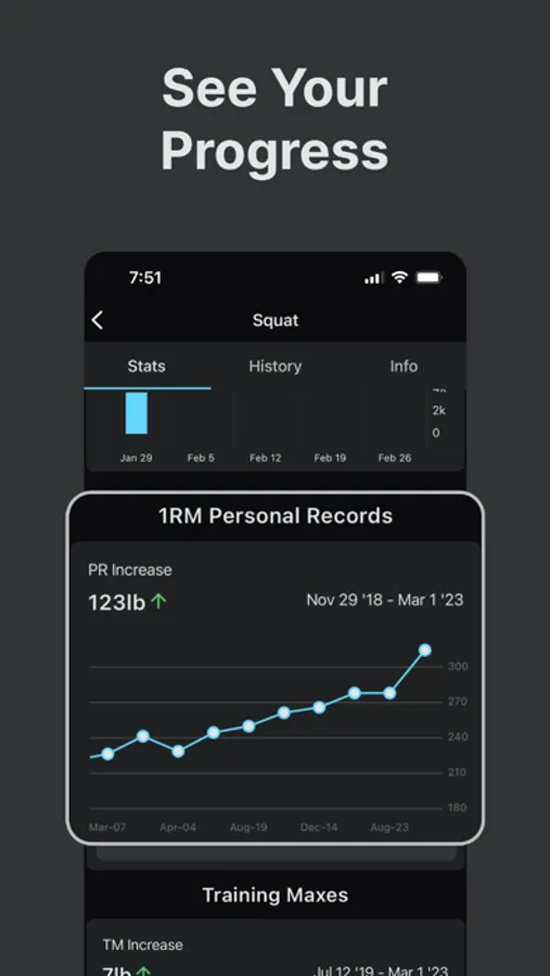 Getting stronger is about putting in the work every week but it's hard to see the progress you are making. The Pro version includes graphs of your one-rep maxes over time. Feel confident knowing you are doing the right things and making progress.