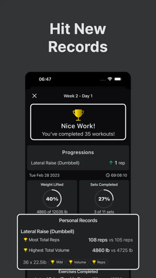 KeyLifts takes the math out of the 5/3/1 program so you can focus on getting stronger. Everything is planned out for you. Know exactly what you need to do as soon as you step into the gym. KeyLifts automatically calculates all your sets so you can focus on hitting new Personal Records.