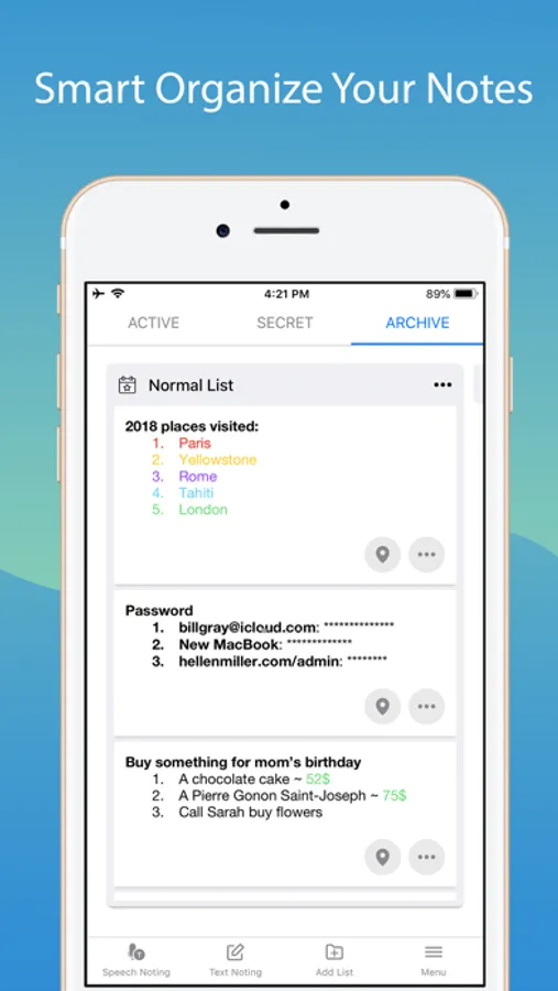 - With 4 Boxes, be easy to organize all your notes: concerning notes in Active Box, security