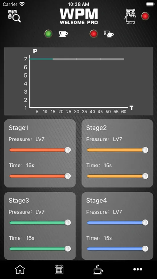 With this WPM app, the user can master the settings of maximum 4 stages of extraction pressure-time profiles for your favourite taste of espresso. It allows you to provide 4 sets of sequential parameters of pressure levels (1 the lowest to 7 the highest) and time duration (0-15 seconds) for the process of coffee brewing. Besides, the user can also preset the pre-infusion level, coffee brewing group temperature as well as the steam duty at fingertips. All these settings can then be wirelessly sent to the machine for activation accordingly. After all, the user can save all those data with corresponding line curve shown into favourite recipes that can be retrieved again easily. Other data such as taste definition, the name of the bean and a photo of coffee made can also be put into the diary for the record.