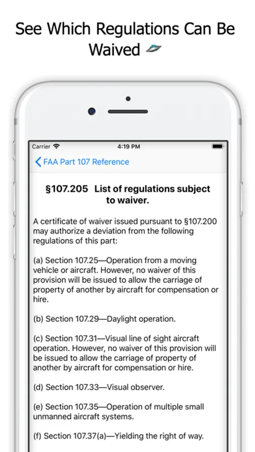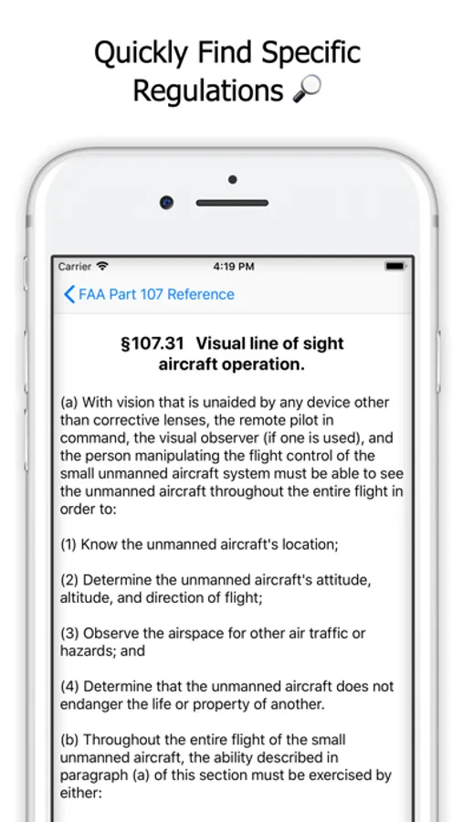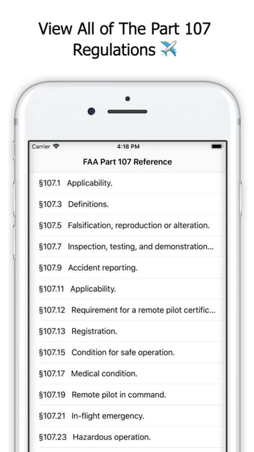 This reference allows you to access any part 107 drone law immediately. It is a great resource for the modern day drone pilot. It also includes Chapter 5 of the FAA's Advisory Circular 107-2 that gives further guidance on how to operate within part 107.