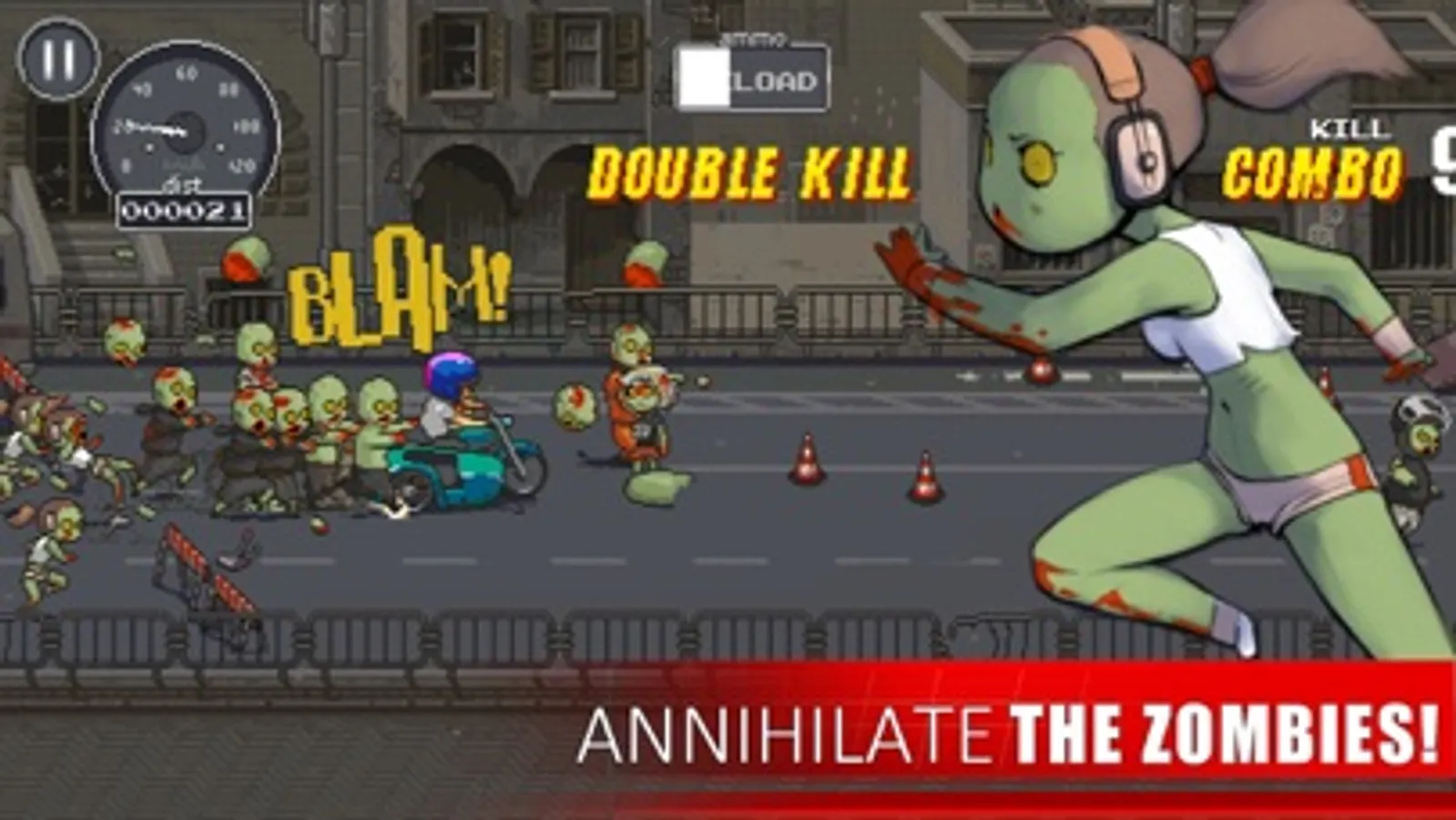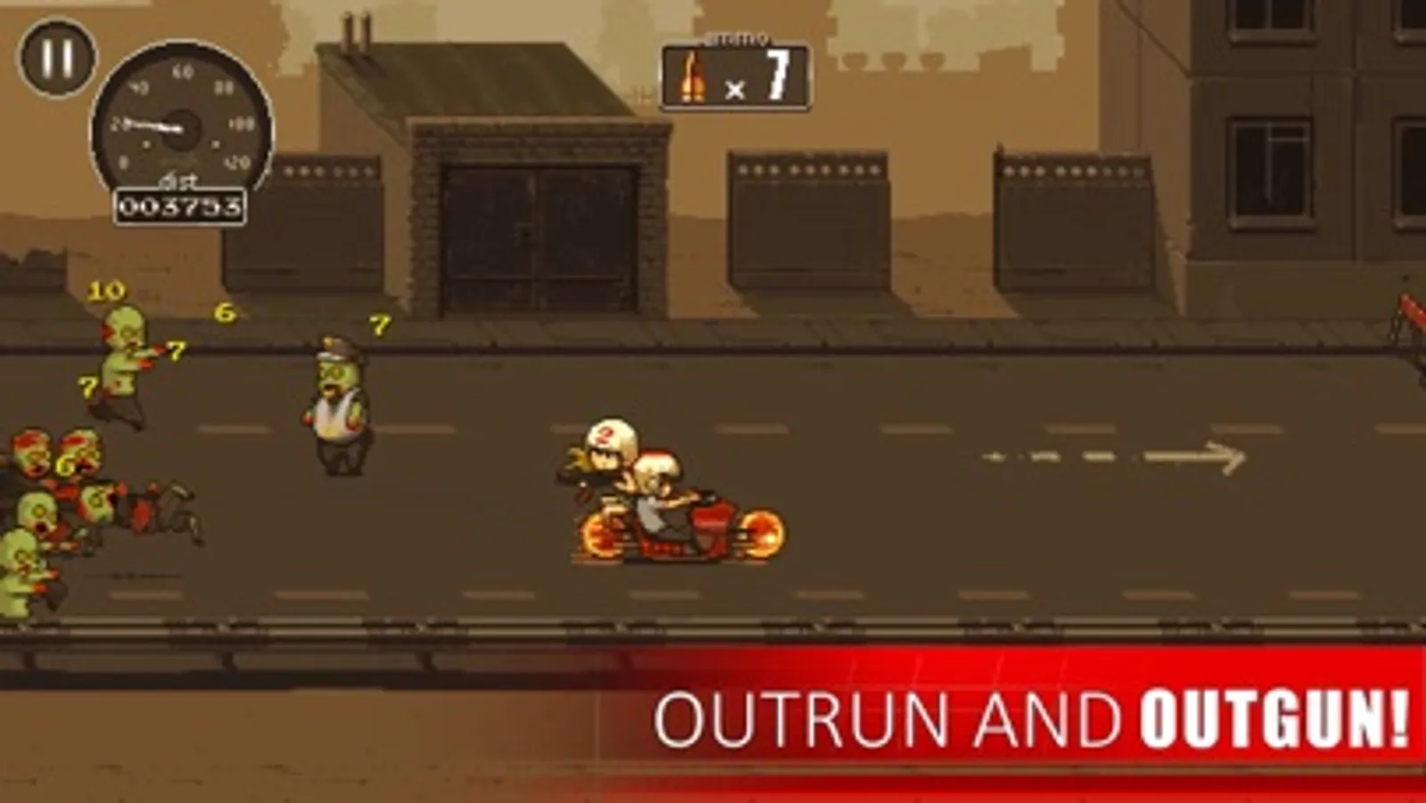 Swerve between abandoned cars, plough through undead crowds and when the dead get too close, get trigger-happy. Visit the Garage to upgrade your ride and your firearms to keep ahead of your pursuers.