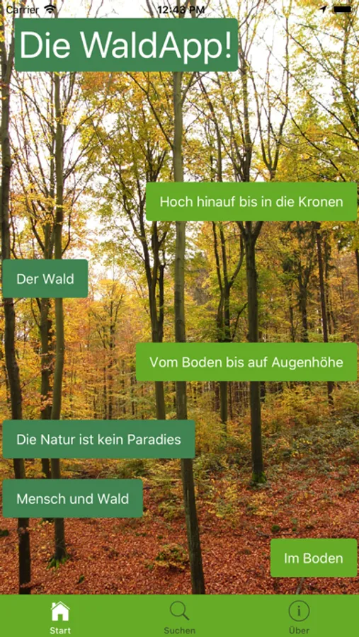Die WaldApp hilft, Wald wahrzunehmen, zu verstehen und zu schätzen. Sie führt trotz hoher fachlicher Ausrichtung leicht verständlich in wesentliche Bereiche des Waldes ein. Bilder, kleine Filme, wo möglich Hörbeispiele und prägnante, leicht verständliche Texte erläutern die einzelnen Bereiche.