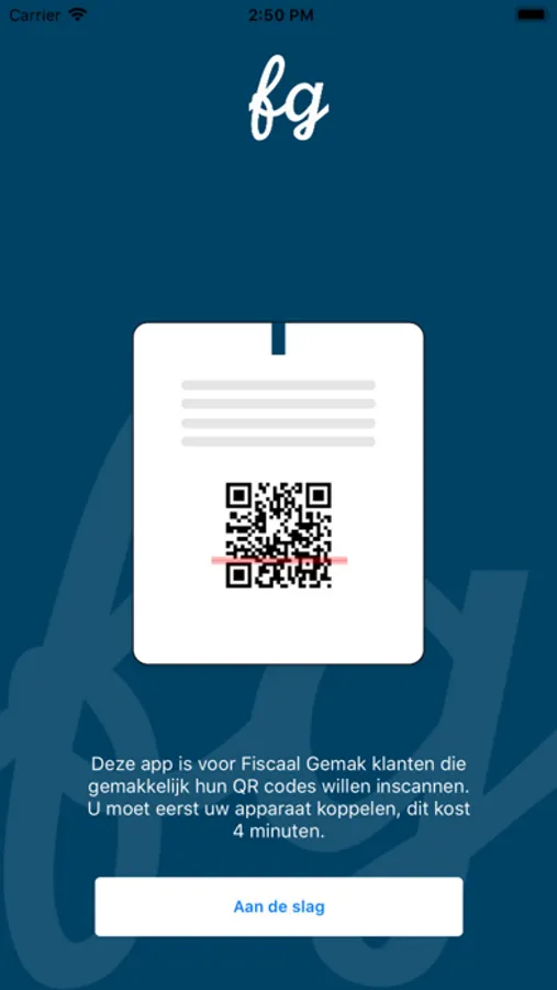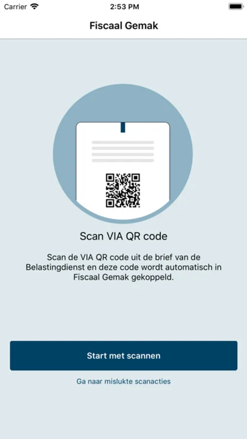 Download op een smartphone de app van Fiscaal Gemak. De app is gratis. Zodra u deze hebt geïnstalleerd kunt u verder.