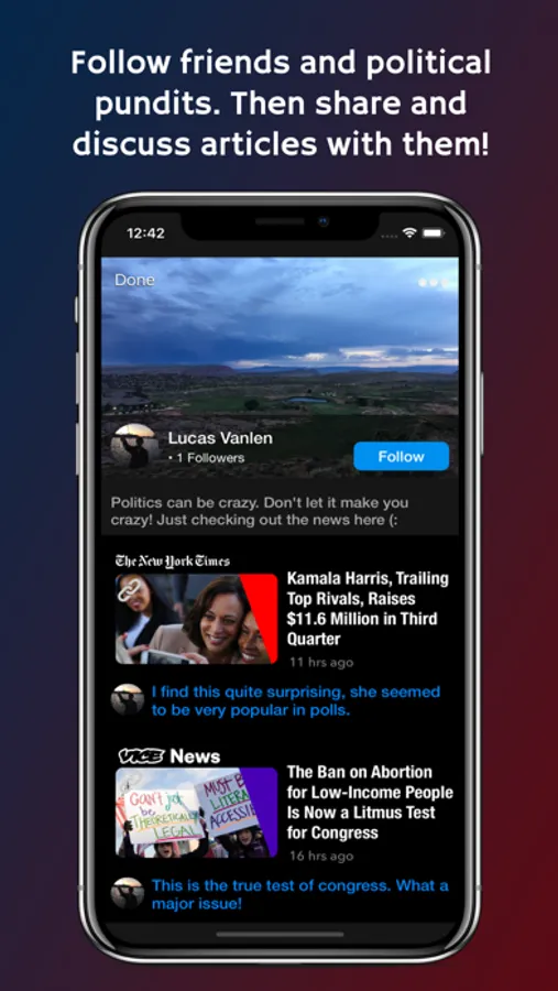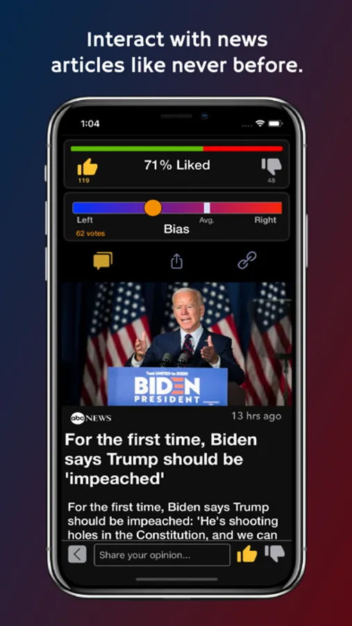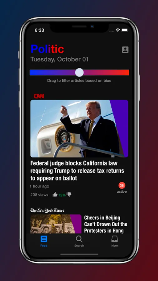 The only app where you judge the bias of news articles. It is as simple as dragging your finger. We all read news articles that we feel are biased. With this app, you are able to prove it. All news articles have an average bias based on the average of what everyone votes the bias to be. Now that each article has an average bias, you have the power to sort your news feed, based on biased or unbiased articles. Interacting with the news, has never been so powerful. Politic is free and does not require a sign in or login. Just download and hop right in. Discover how politics should be. Discover Politic.