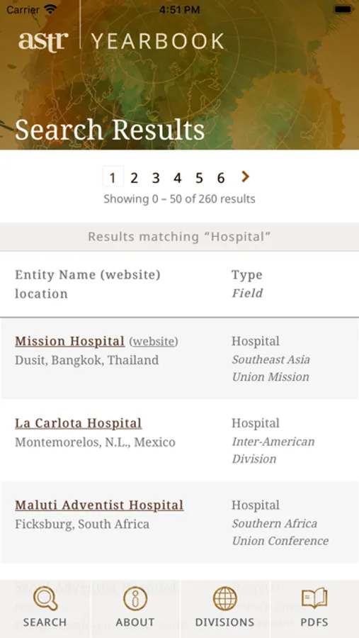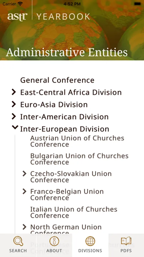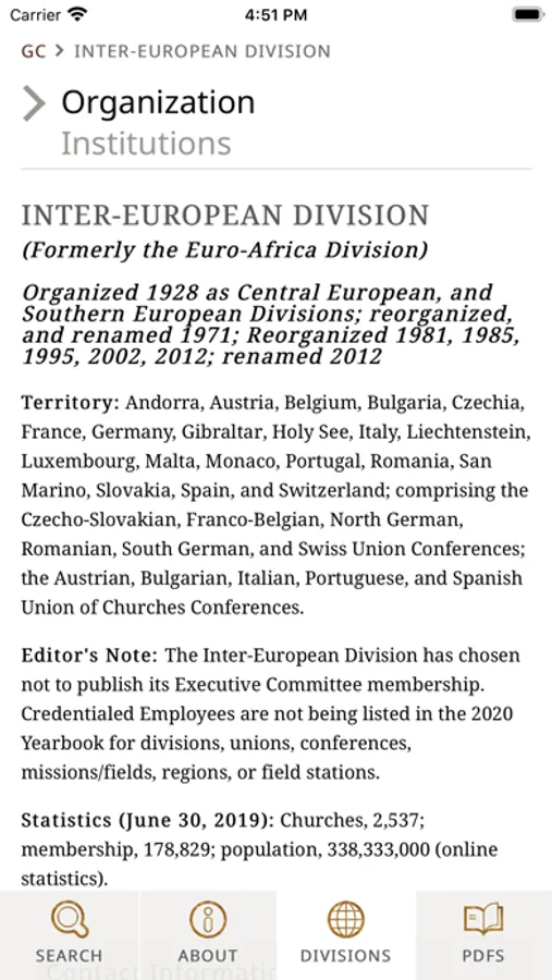 The Yearbook App contains information on entities and institutions that are fully owned and operated by the Seventh-day Adventist Church, as well as other general information. The app, when connected to the internet will reflect changes as they are made to the Yearbook database at the General Conference. The Yearbook App may be used to search this content. Advanced search features allow users to filter results by a number of factors including region. Searching previous year’s data is also available when online. However, offline access will be limited to the current version of the yearbook only.