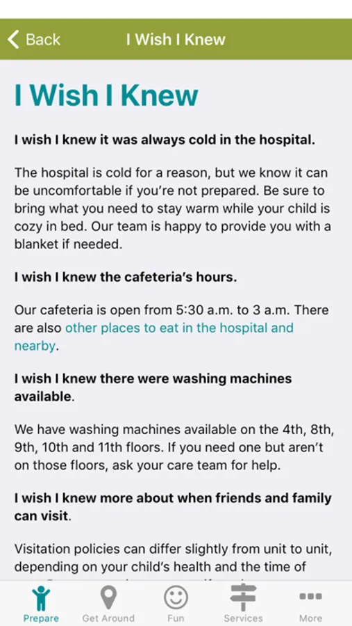 - Helpful services: Dining options at the hospital and in the community, interpreters, religious services