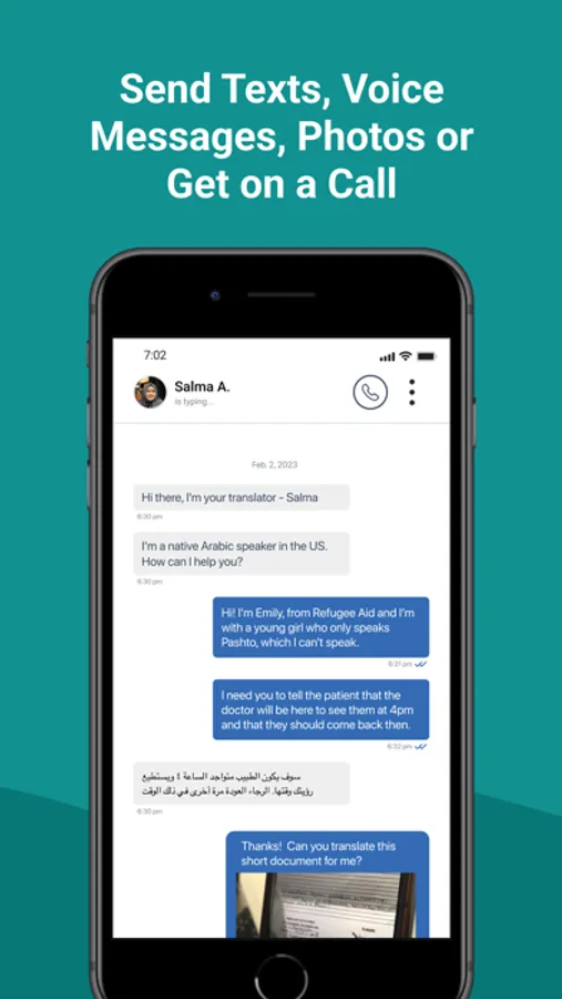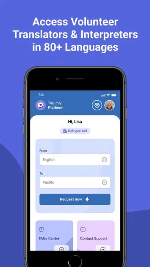 2 - Refugees and aid-workers sign up and request a translator based on their needs (like asylum interviews, emergency medicine, navigating a new country, or any humanitarian need). Tarjimly uses machine learning to connect them with the best available translator, within minutes. Once connected in a live session they can exchange text messages, pictures, voice messages, and get on an internet phone call.