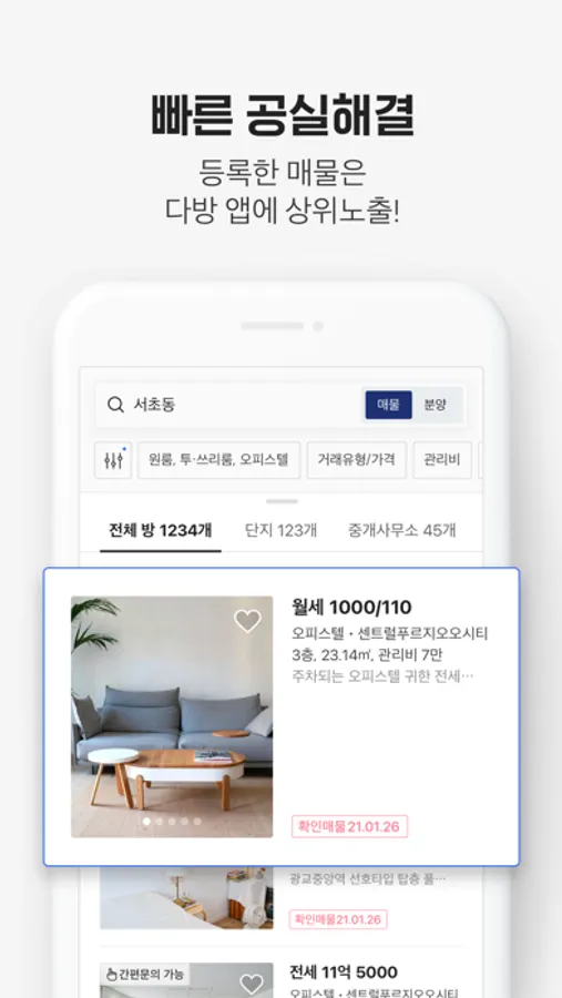 등록된 매물은 확인을 거쳐 '확인 매물'로 처리 되며, 다방에 상위 노출되어 빠르게 공실을 해결할 수 있습니다.