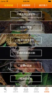 收錄了楊懿如、李鵬翔兩位老師所撰寫的蛙類總論共十篇,對台灣的蛙類動物做了深入淺出的精采介紹,此外還有本APP的隱私權聲明與使用說明等資訊。