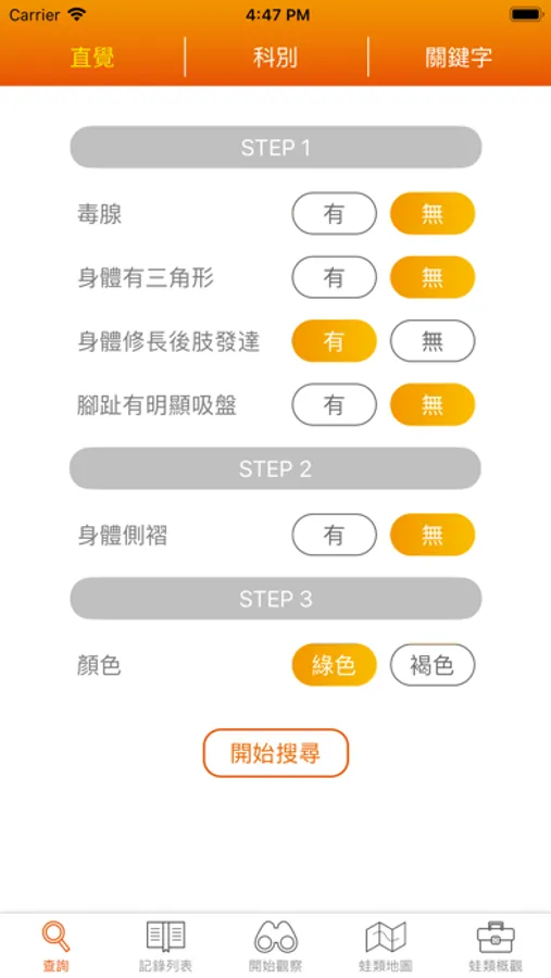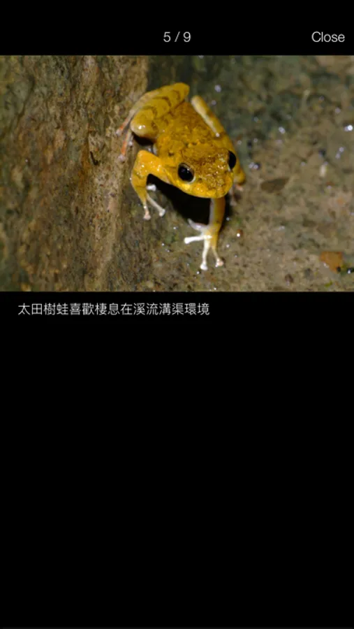 收錄全台野外所有蛙類的所有文圖資料。使用者可依青蛙外型選擇是否有毒腺、身體三角形、身體修長後肢發達、腳趾有明顯吸盤等四大不同特徵,再依蛙身是否有側褶、體色進行篩選,直覺性尋找野外見到的蛙類物種。