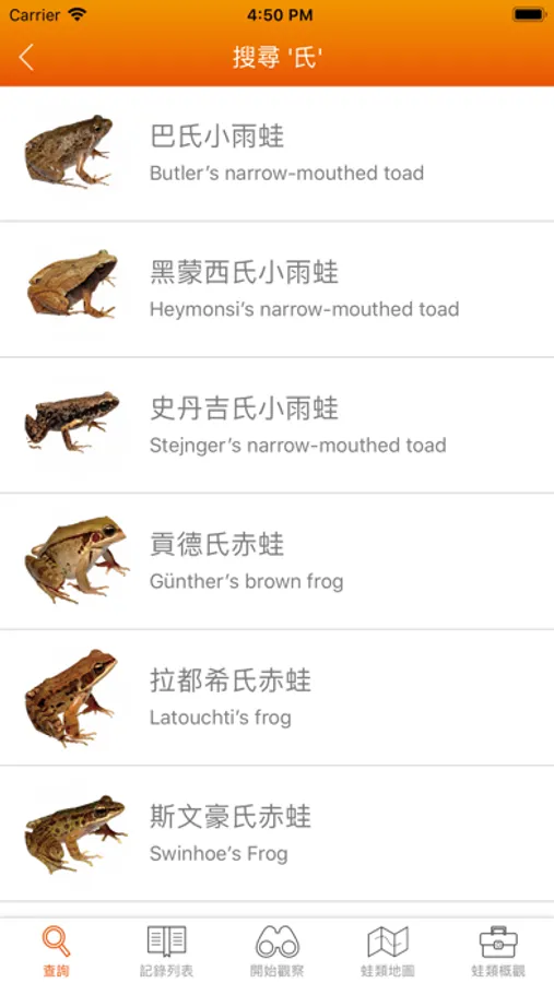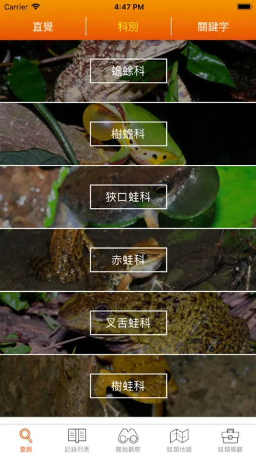 也可直接依科別以及關鍵字直接檢索,閱讀物種的個論資料。個論中特別收錄所有蛙類的野外錄音資料庫,令使用者除了文圖外,也能學習青蛙在野外的其他重要辨識資訊。