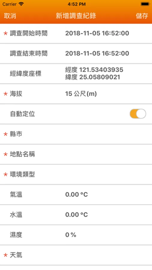 使用者在野外觀察青蛙時,可立刻按下「開始觀察」,手機即會自動以GPS定位所在地的經緯度與海拔,可用鏡頭拍照或相簿匯入功能新增蛙類照片,將必填欄位完成後,即成一筆記錄,存檔後可在「記錄列表」中隨時繼續編修。