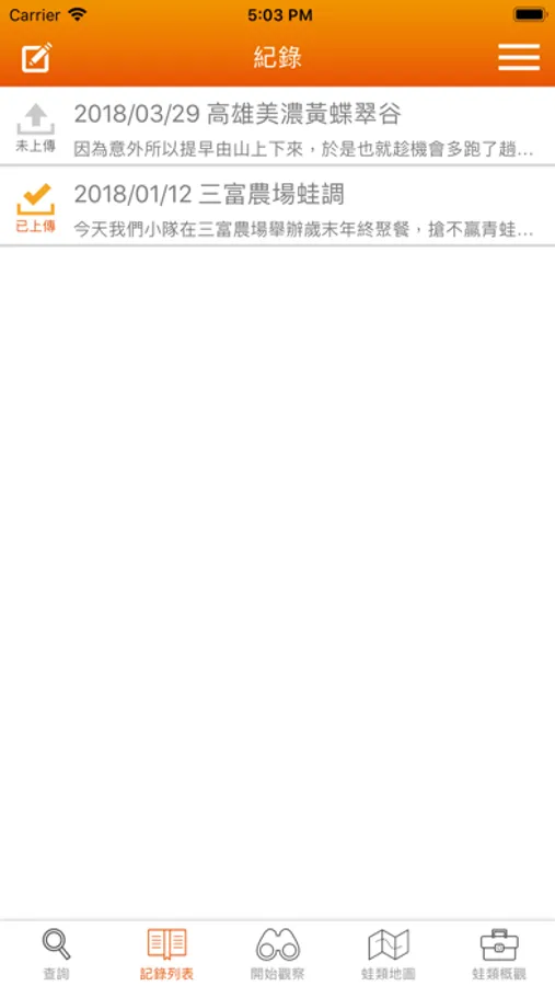 在「記錄列表」中儲存的觀察記錄,可由右上角的功能列上傳至台灣兩棲保育網(http://www.froghome.org/)的資料庫中,若您已有此網站的帳密可直接登入,也可以本APP直接註冊。觀察記錄上傳後會由此網站的團隊審核,可在網站介面中確認是否成功上傳或被退回,以繼續進行資料修正與重新上傳。