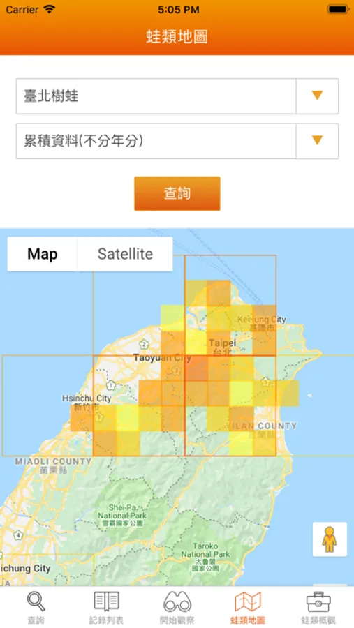 本功能直接連線至台灣兩棲保育網資料庫中累積的所有觀察資料,令使用者能夠得知全台所有蛙種於不同年份/不分年份的情況下,在台灣的分布,並可自由縮放以查看更為精確的坐標。並可切換地圖模式令使用者得以依不同需求檢視資料。