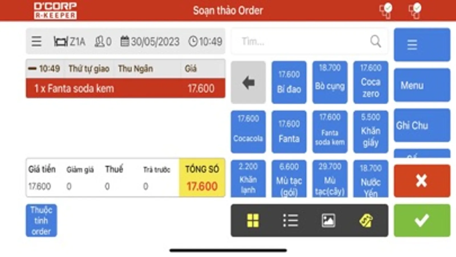 > Fully functions and complete service process from ordering, changing tables, joining tables, entering discount codes, printing out a pre-check, until executing a payment.