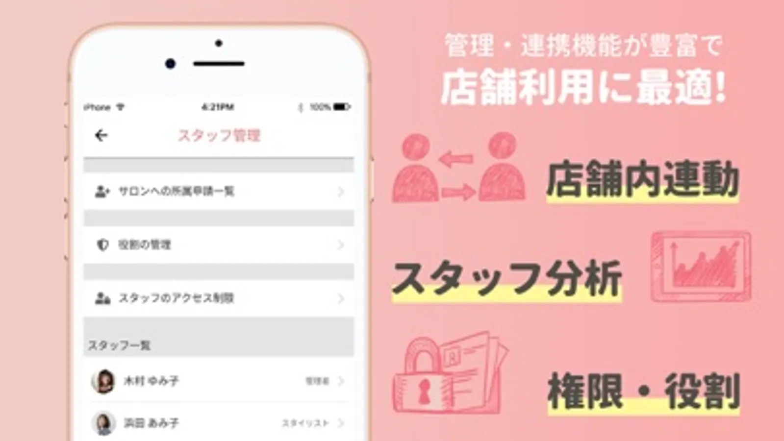 スタッフ個別に権限設定を行うことで、大切なお客様の個人情報を適切に管理できます。また、保存しているデータは暗号化して適切に管理しているので安心です。