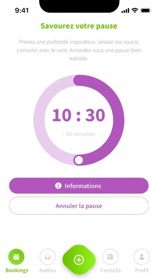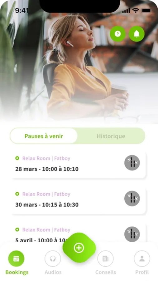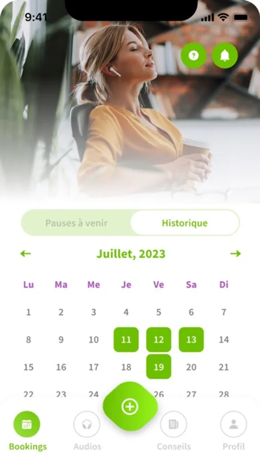 Vous avez la chance d’avoir d’un espace WorkInJoy au travail, alors cette application est votre alliée. Elle vous permet de réserver votre pause dans votre nouvel espace de détente tout en étant certain de ne pas être dérangé. Cette application vous accompagne dans votre démarche de lâcher prise en mettant gratuitement à votre disposition des séances guidées de relaxation et de méditation. Vous y trouverez des conseils et d’autres surprises. Suivez vos statistiques et optimisez votre vitalité.