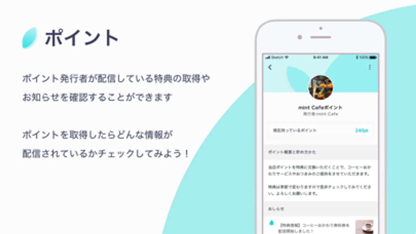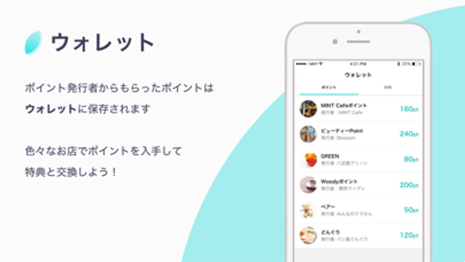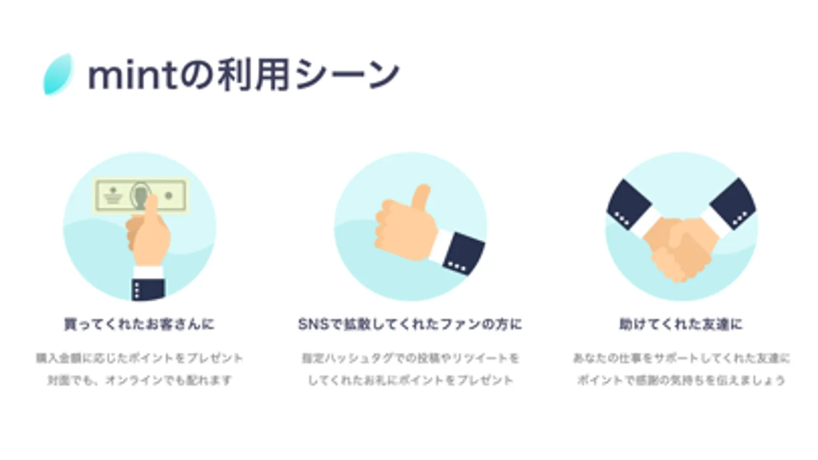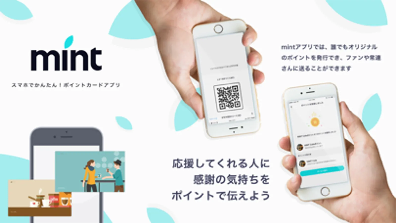mintは、だれでもオリジナルのポイントを作って、お客さんや応援してくれる人に送ったり、受け取ったりできるアプリです。