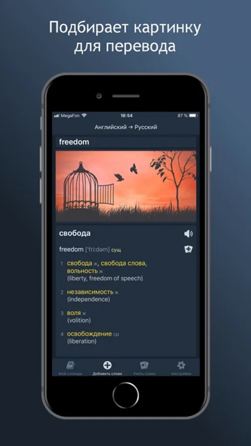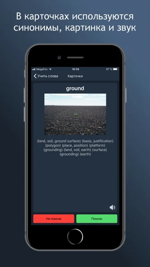 • карточки для запоминания содержат картинки, синонимы и озвучку слов