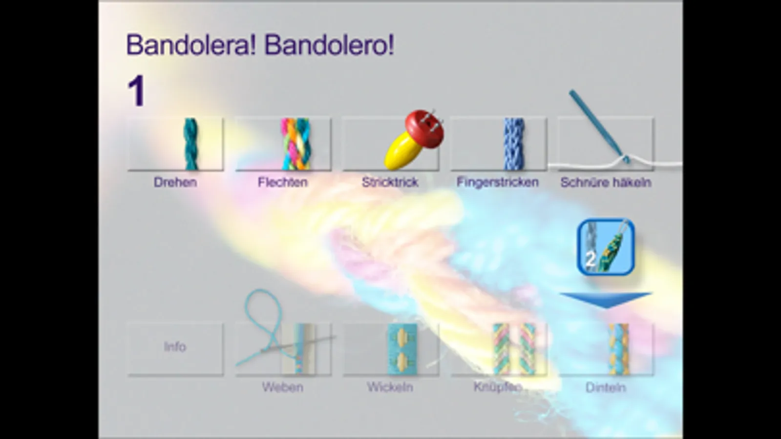 «Bandolera! 1» widmet sich mit 38 Filmen – alle ohne Ton – folgenden Themenkreisen: Kordeln drehen, Zöpfe flechten, Zöpfe backen, Stricktrick und Fingerstricken. Beim Thema «Schnüre häkeln» kann gewählt werden, ob die Führung der Häkelnadel für die linke oder rechte Hand gezeigt wird.