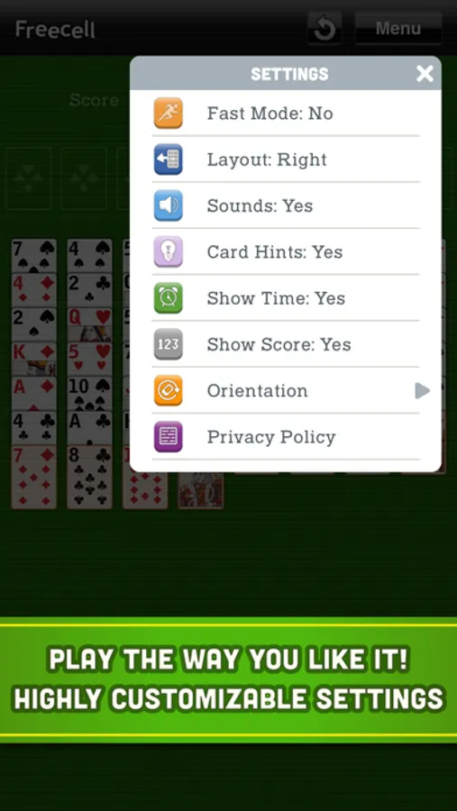 - Highly customisable from the simple game menu: you can turn on/off sounds and hints, choose your layout, see your time and score and so much more.