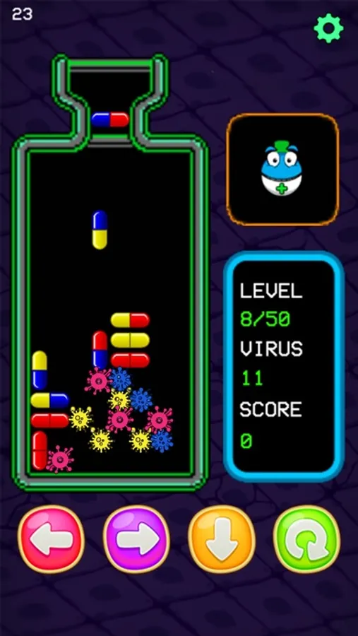 Dr. Virus is a falling block tile-matching video game in which DR.Virus assumes the role of a doctor, tossing two-colored medical capsules into a medicine bottle representing the playing field. This area is populated by viruses of three colors: red, yellow, and blue, which stay in their starting position until removed, the player manipulates each capsule as it vertically falls 1 unit of space at a time, able to move it left or right and rotate it 90 degrees in either clockwise or counter-clockwise. When four or more capsule halves or viruses of matching color are aligned in vertical or horizontal configurations, they are removed from play. Any remaining capsule halves or whole capsules which are now not supported by a virus or capsule will fall to the bottom of the playing field or until it hits another supported object, and any new 4-in-a-row alignments created from this will also be removed.