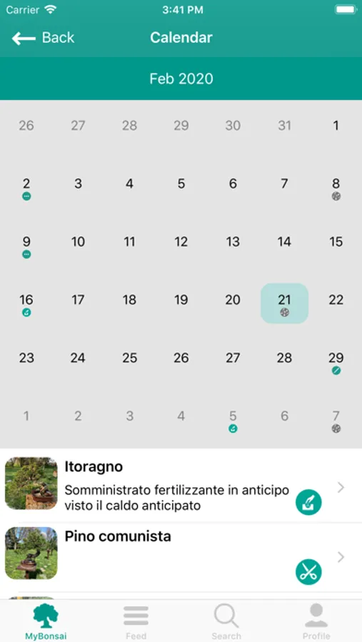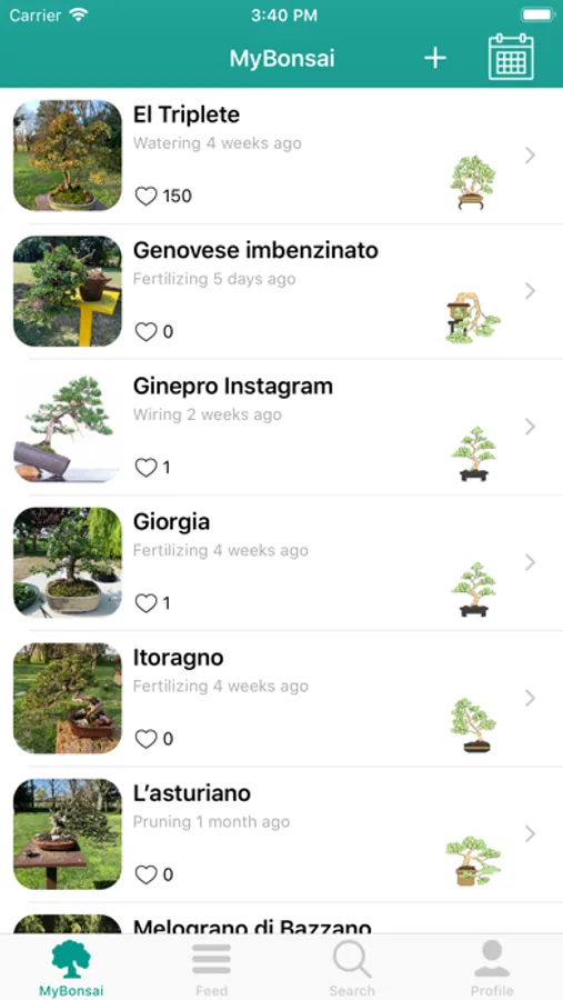 • One of the main feature is the possibility to save and store a trace of works applied to your small trees. Take care to your bonsai and save all kind of works like Irrigation, Fertilizing, Pruning, Wiring, Repotting, Propagation, Fungicide, Acaricide, Defoliate, Woodwork, Grafting, and so on…