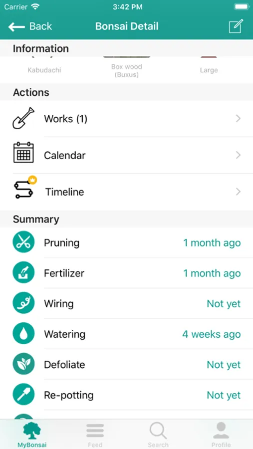 • Timeline: use the timeline to explore all past images of your works bonsai and all its evolutions. The timeline is an amazing feature to know in details the evolutions of your plants.