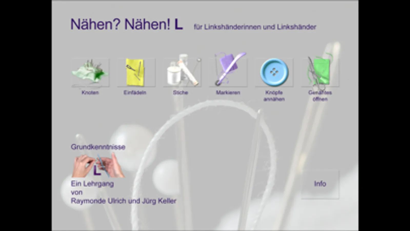 30 Lehrfilme vermitteln die Grundkenntnisse zum Thema «Nähen von Hand» für Linkshänderinnen und Linkshänder. Dabei liegt der Schwerpunkt auf Techniken, die auch beim Gebrauch der Nähmaschine immer noch von Hand ausgeführt werden müssen, vom Anfangsknoten bis zum Öffnen von Genähtem.