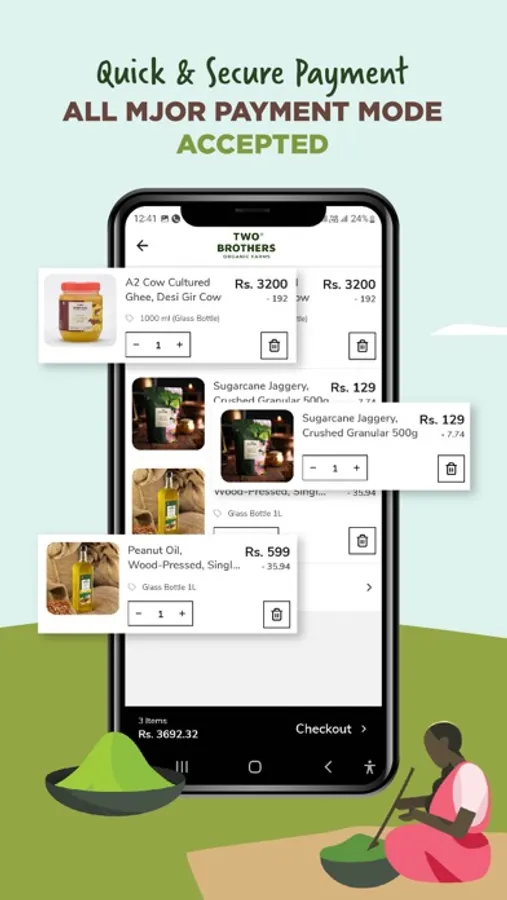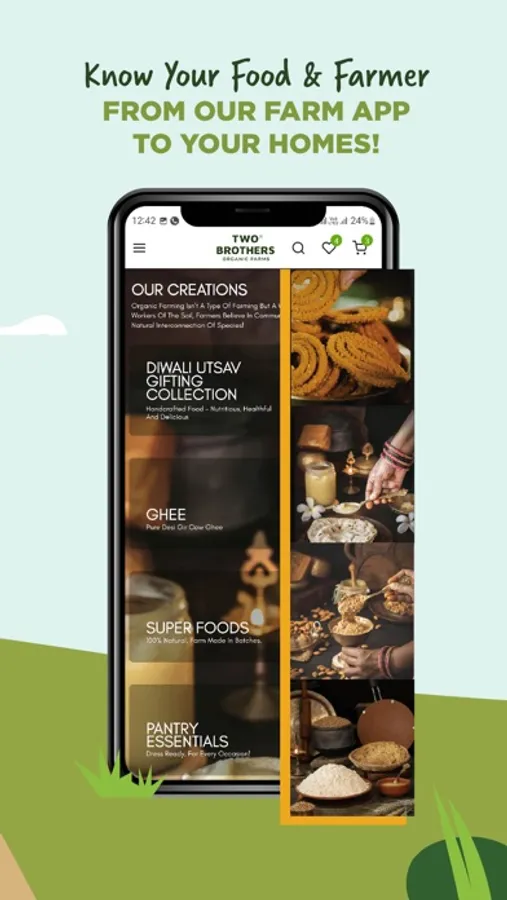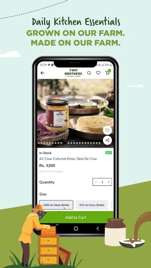 A2 Ghee made of ‘Makkhan’ from Curd, using Ancient Bilona Technique, from the Milk of Free Grazing Native Gir Cows on our Organic Farms | Stoneground Emmer ‘Khapli’ Atta made of Heirloom Seeds Native to Mother Nature. NO HYBRID | Amlaprash made of handpicked Amla’s grown on our Organic Farms, crafted with 40+ Native Herbs and our A2 Ghee on Iron ‘Kadhai’s | Our Coldpressed Oil is made using Groundnut grown on our farm from Native Seeds