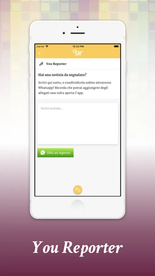 • You Reporter: l'utente può scrivere una notizia e condividerla attraverso Whastapp direttamente con la redazione
