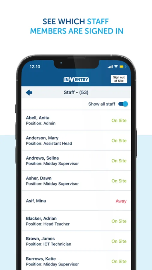 The staff element of the app allows users to remotely sign in and out of their organisation, using their device instead of using the InVentry touchscreen or ID card. They can also see at a glance who has signed in on that day. This is particularly useful if users quickly need to know if someone is onsite or not.