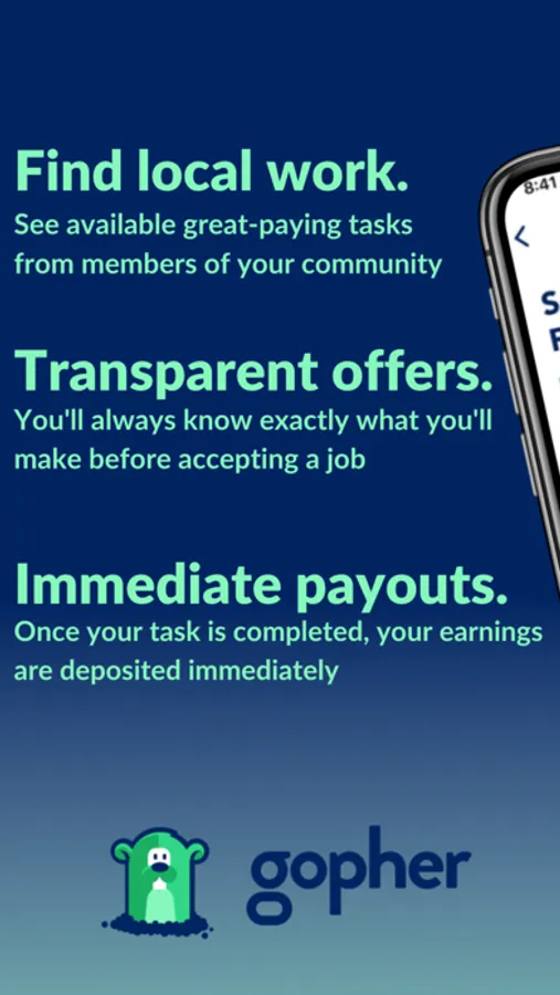 Welcome to the Gopher GO App, where finding good paying gigs, that fit your skills and availability is easier than ever. Gopher is an on-demand community marketplace app, offering you a host of opportunities to make money in your spare time.