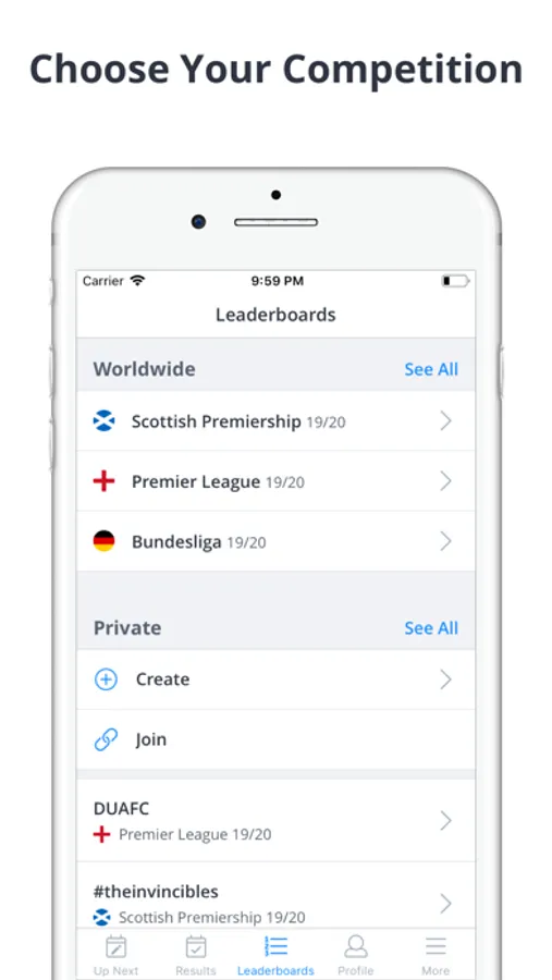 You can join or create private leaderboards to compete with your friends. Leaderboards can last for the duration of a season or for a specified time.