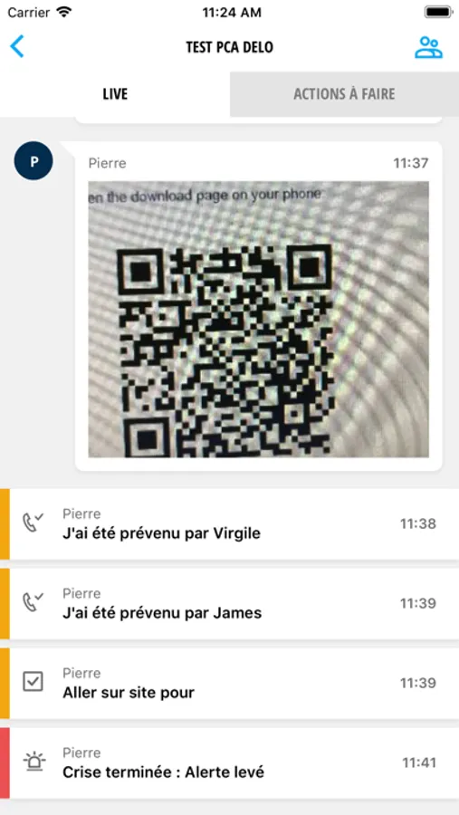 Cette fonctionnalités permet d'avoir l'ensemble des événements, messages, actions, photos issus des intervenants du PCA. Tous les membres des comités équipés peuvent suivre les évolutions à distance.