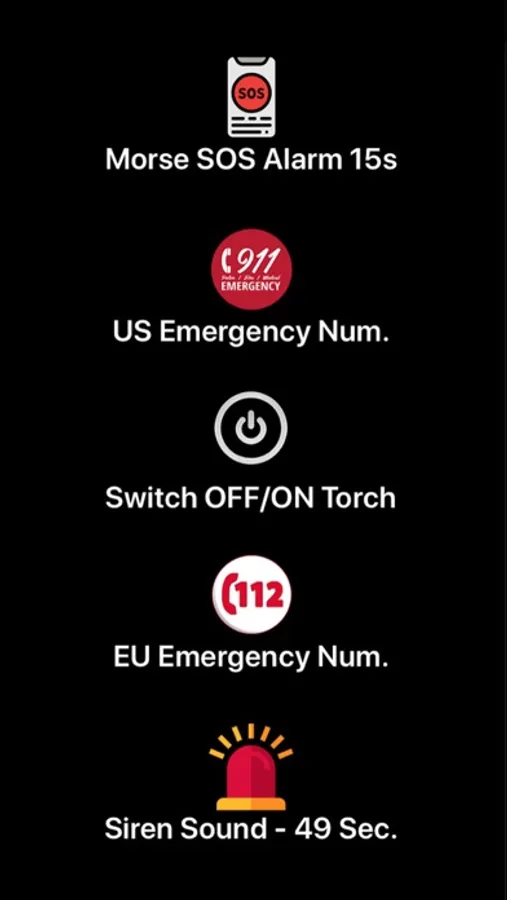 Multi-function app useful in times of need. It has a speed dial button for American and European emergency numbers, two audio buttons with vise clamp and siren and a practical flashlight button. Five practical tools all on one screen.