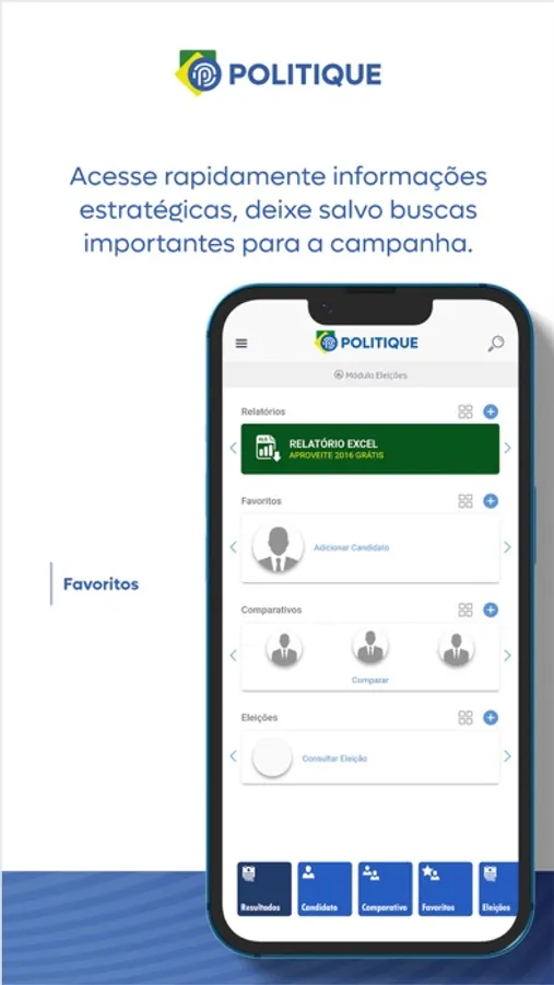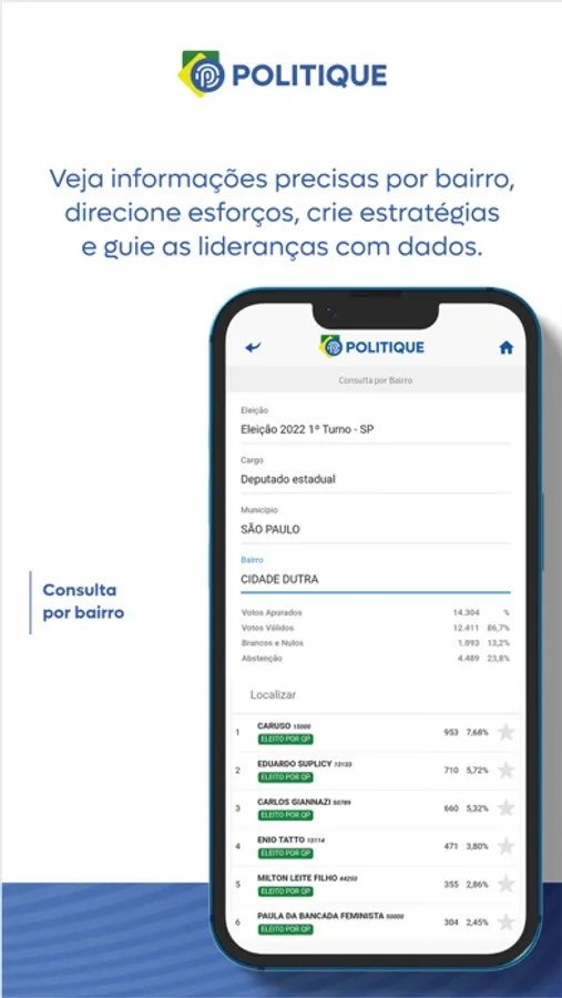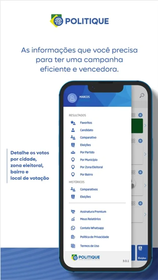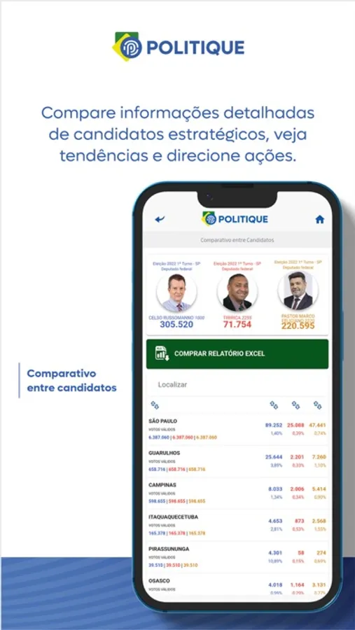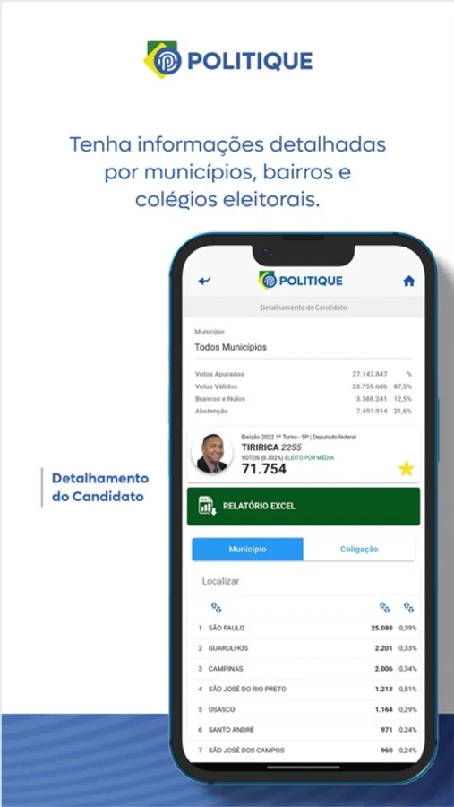 Com o App Politique, você consegue detalhar os votos dos candidatos por município, bairro e local de votação, podendo assim, planejar uma próxima eleição, ou analisar os locais onde cada candidato obteve determinado desempenho, além disso, poderá realizar comparativos com outros candidatos detalhando por município, bairro e local de votação.
