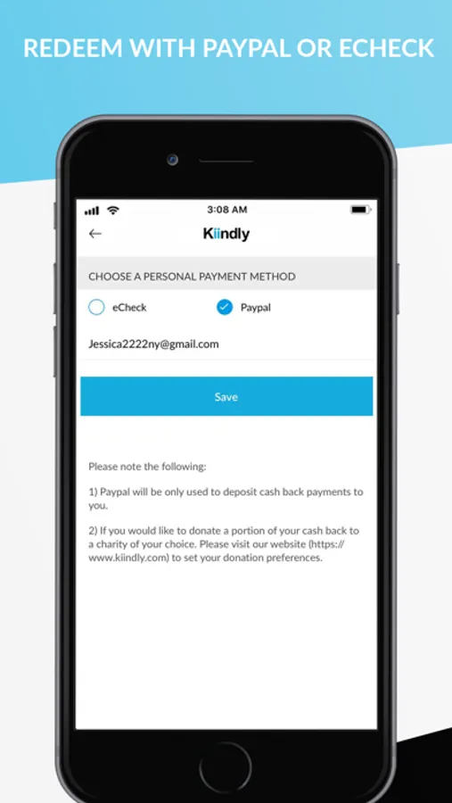 3. Use PayPal/eCheck to receive your cashback. Kiindly is a safe and secure shopping offer app!