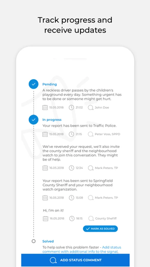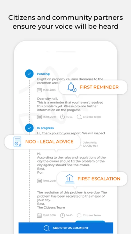Once you submit an issue, the app sends your report to the appropriate local administration for resolution. You can track progress and receive updates directly in the app. Citizens ensures your voice will be heard by sending reminders and escalating issues when needed.