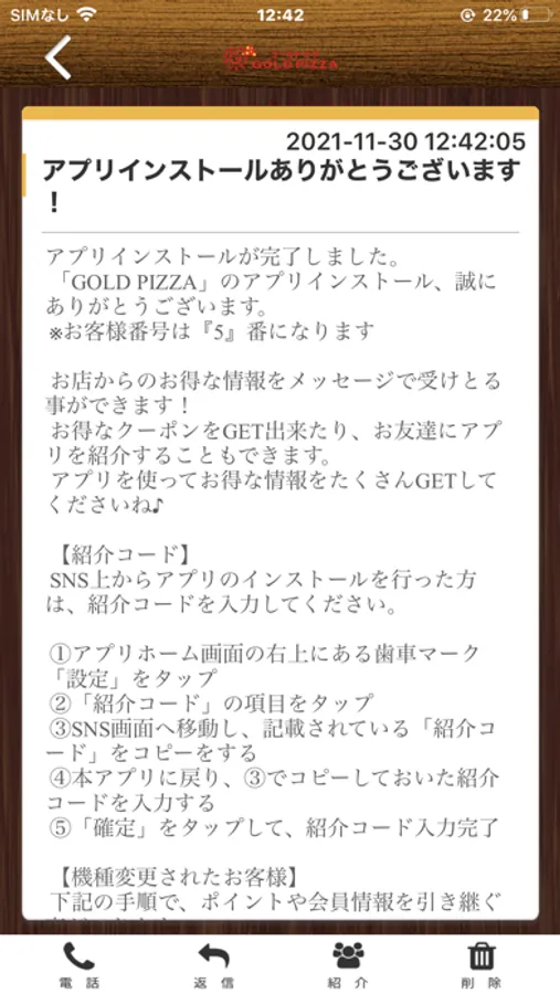Gold PizzaのアプリをSNSを通じてお友達に紹介する事ができます。