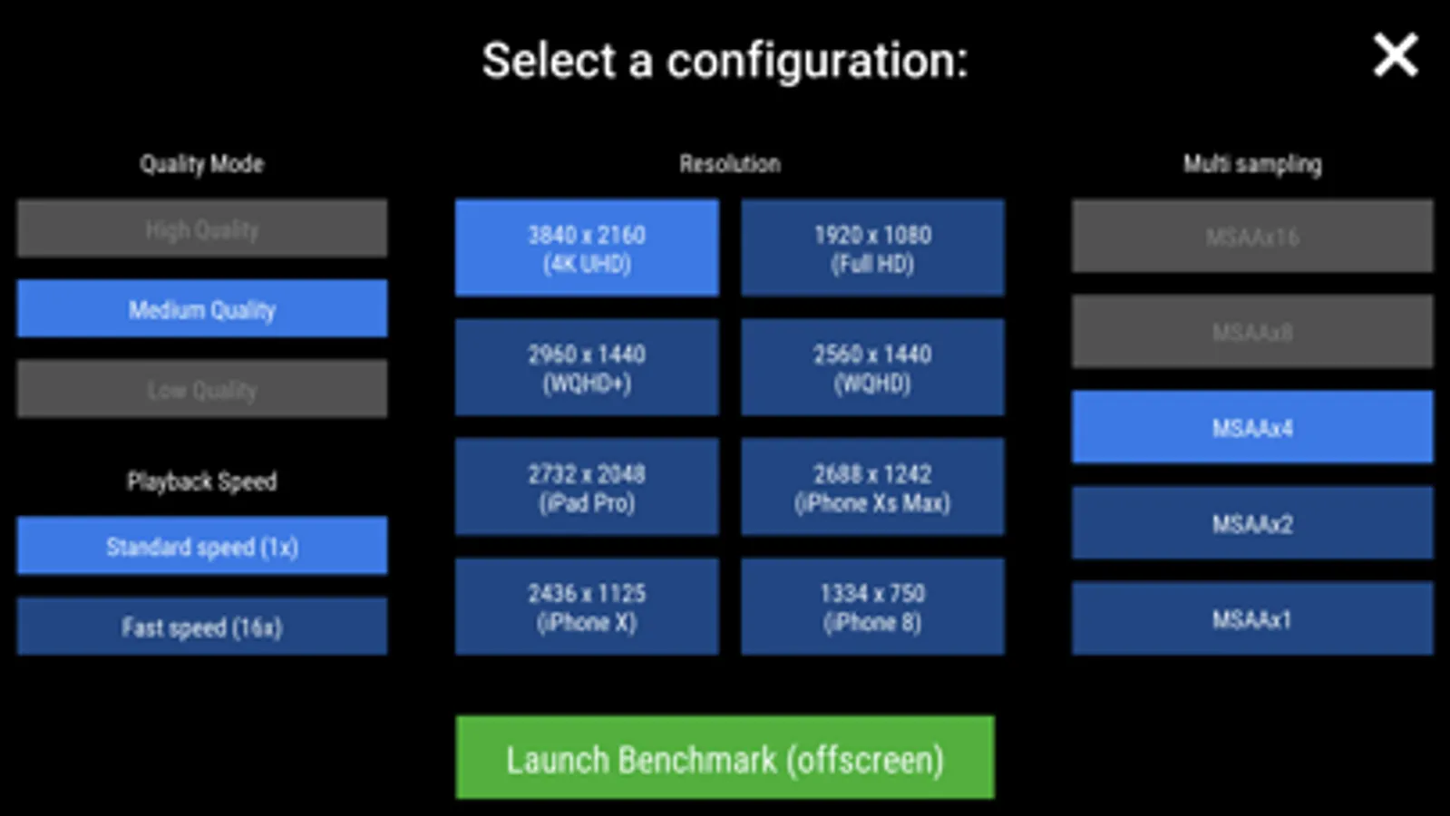 While on-screen Benchmark Mode is limited to the native resolution of your device, with off-screen Benchmark Mode you can measure performance rendering at 4K resolution! This makes it easier to compare devices for performance in the same conditions and shows how your device would perform if it were to output to a 4k TV for example.