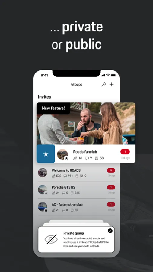 - Create public or private groups and experience ROADS together with the worldwide community of passionate riders