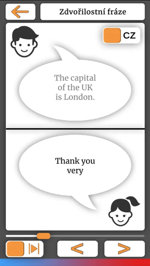 Aplikace určená k procvičování angličtiny pomocí poslechu anglických rozhovorů. Tématicky se jedná o rozhovory běžně užívané v normálním životě.