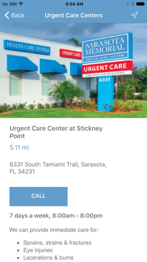 The Symptom Checker will help you know whether you should visit an urgent care or an ER for your condition, and its navigation feature will direct you to your chosen Sarasota Memorial Health Care System Urgent Care location.