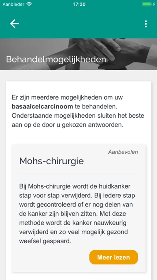 Op basis van de meest recente Nederlandse richtlijnen, betrouwbare medische publicaties en de data van het beloop van meer dan tienduizend ingrepen geven wij u een gepersonaliseerd antwoord op deze vragen. Let u op! Het besluit over de juiste behandeling van uw huidkanker neemt u samen met uw behandelend arts. De applicatie is uitsluitend gemaakt om u een idee te geven van uw behandeling.