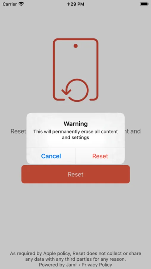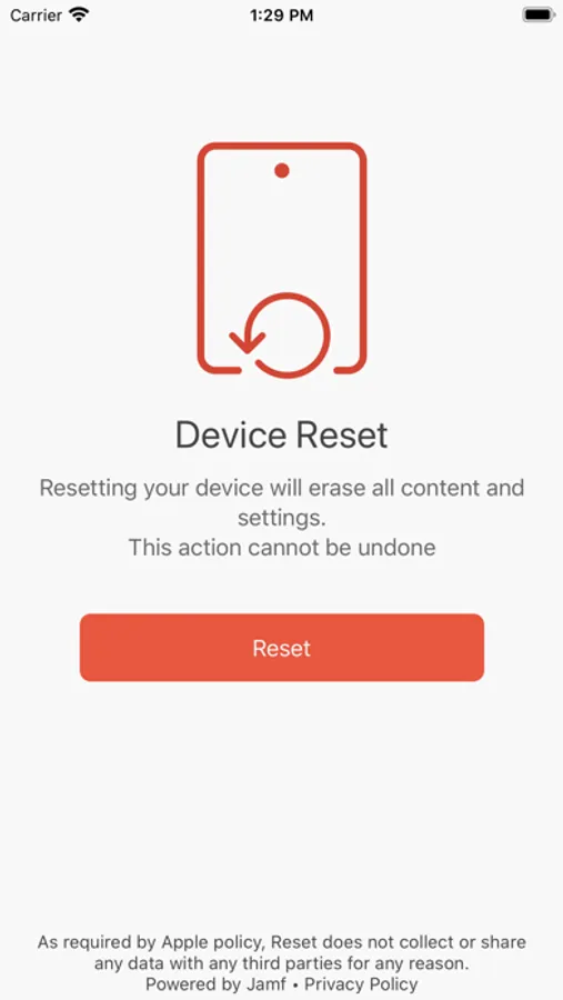 Jamf Reset allows any organization to offer a native Apple experience on iPhone or iPad, while providing home screen access to a simple device reset workflow. Jamf Reset makes it easy for shared device users to reset the device at the end of a day, end of a stay, or any time a refreshed device is needed for the next user.