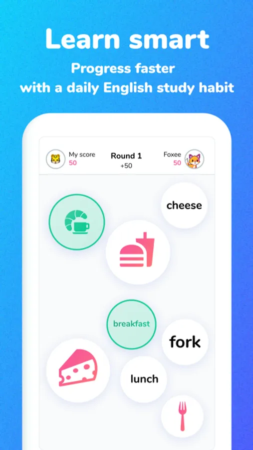 Open up the world of English through fast-paced study games with friends, other users, or battle against our AI study-buddies.