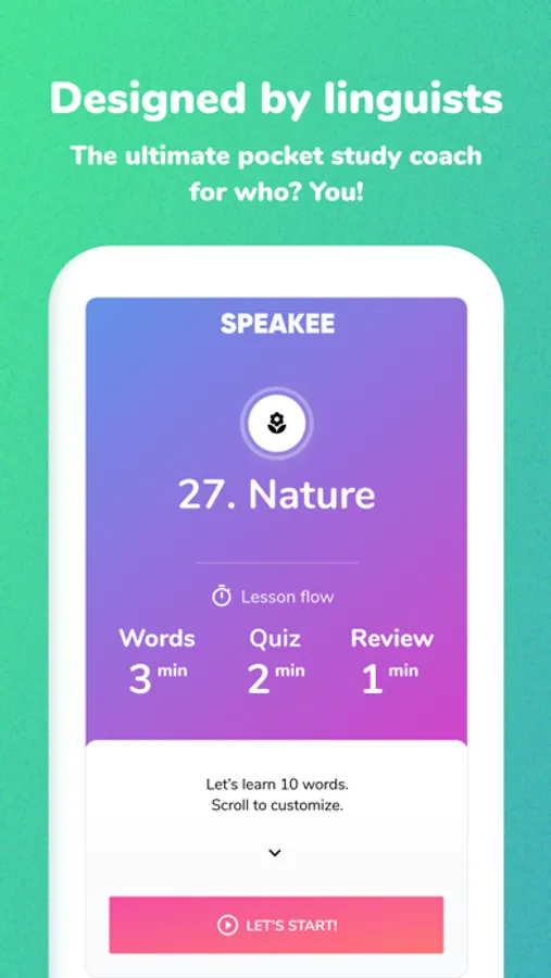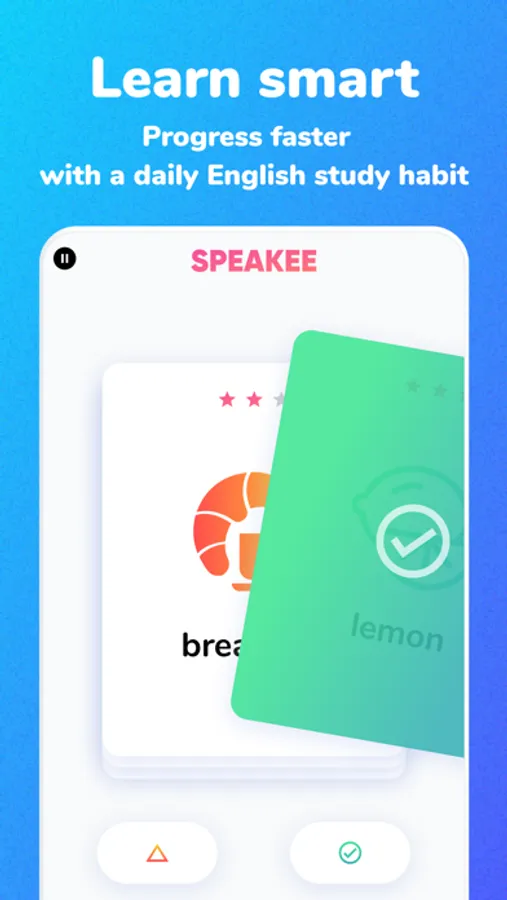 Speakee learns how YOU learn and teaches you what YOU need to know. We know how hard it is to learn the thousands of words you need to communicate in English. We've taken the pain out of the process and made it easy to pick up a daily English study habit that lasts and lasts.